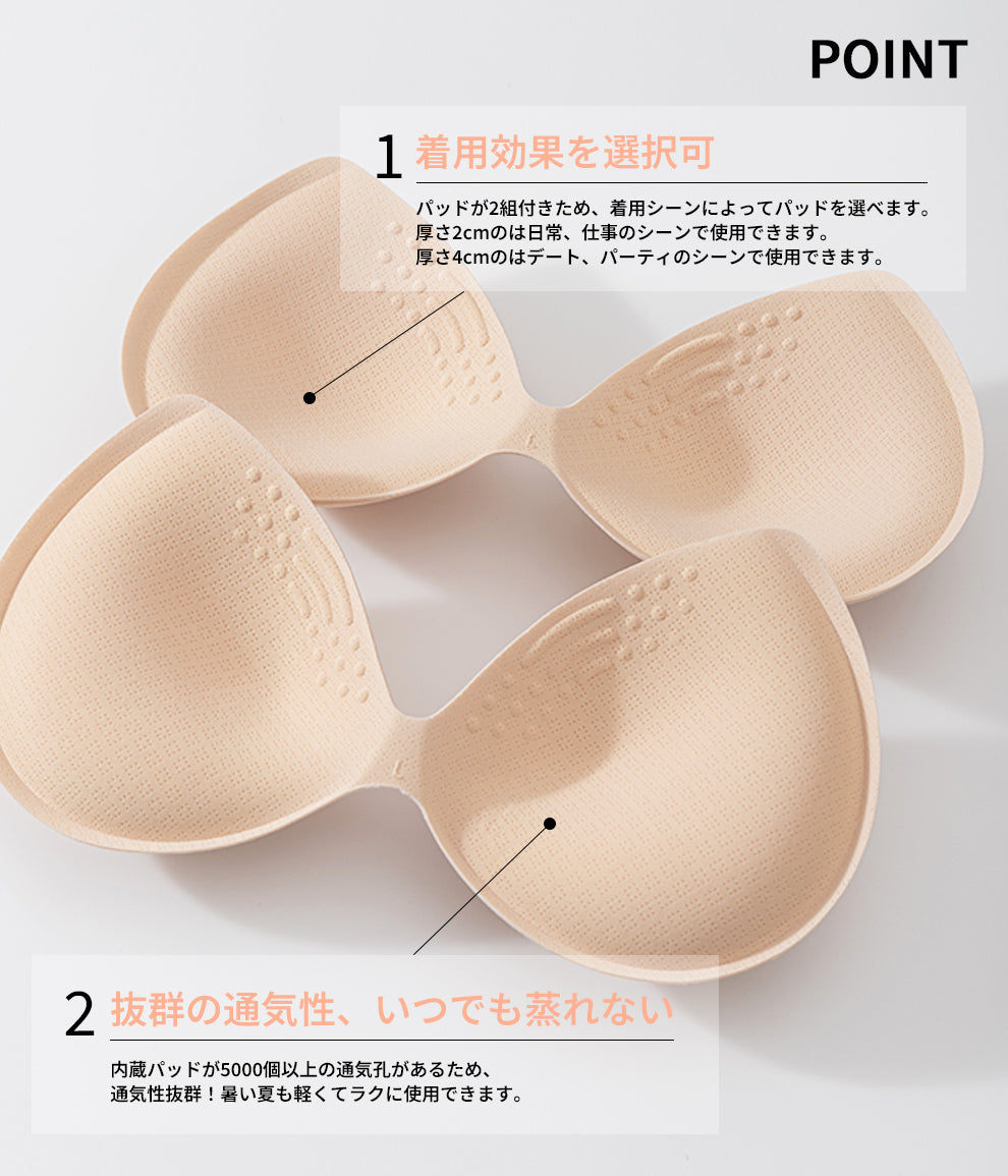パッドが2組付きため、着用シーンによってパッドを選べます。厚さ2cmのは日常、仕事のシーンで使用できます。厚さ4cmのはデート、パーティのシーンで使用できます。